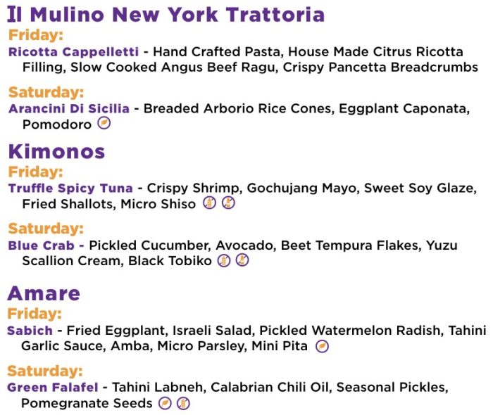 There is still lots more options! You can try the Ricotta Cappelletti on Friday and the Arancini Di Sicilia from Il Mulino New York Trattoria. The from Kimonos, you can try the Truffle Spicy Tuna on Friday and the Blue Crab on Saturday. On Friday you can try the Sabich from Amare, and on Saturday you can grab the Green Falafel.