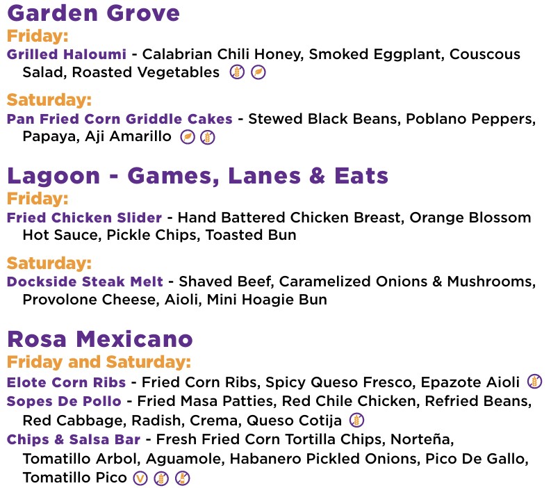From Garden Grove, you can taste the Grilled Haloumi on Friday and the Pan Fried Corn Griddle Cakes on Saturday. You can try the Fried Chicken Slider or the Dockside Melt from Lagoon. Then from Rosa Mexicano, you can try the Elote Corn Ribs, Sopes De Pollo, and Chips & Salsa Bar.