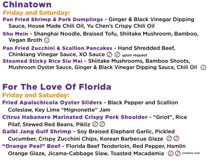 From the Chinatown booth, you can grab Pan Fried Shrimp & Pork Dumplings, Shu Mein, Pan Fried Zucchini & Scallion Pancakes, and Steamed Sticky Rice Siu Mai. From the For the Love Of Florida booth, you can try Fried Apalachicola Oyster Sliders, Citrus Habanero Marinated Crispy Pork Shoulder, Galbi Jang Gulf Shrimp, and “Orange Peel” Beef.