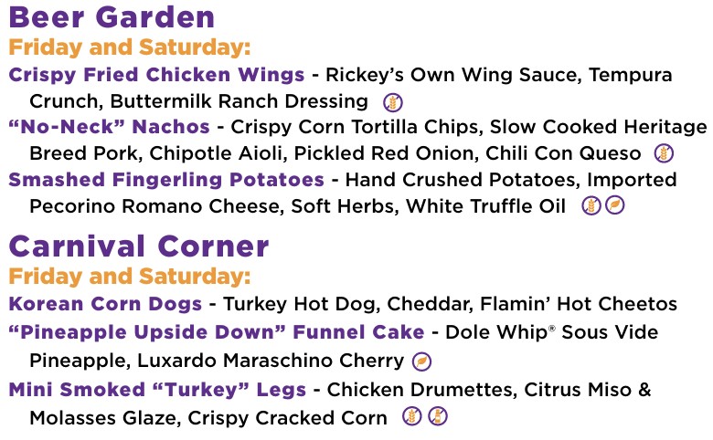 At the Beer Garden, you can grab Crispy Fried Chicken Wings, “No-Neck” Nachos, and Smashed Fingerling Potatoes. At the Carnival Corner, you can chow down on Korean Corn Dogs, “Pineapple Upside Down” Funnel Cake, and Mini Smoked “Turkey” Legs.