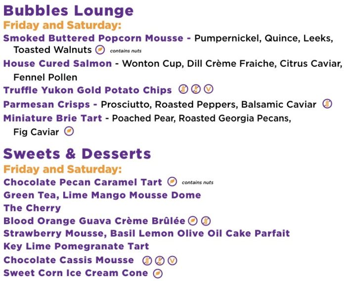 From the Bubbles Lounge, you can grab Smoked Buttered Popcorn Mousse, House Cured Salmon, Truffle Yukon Gold Potato Chips, Parmesan Crisps, and a Miniature Brie Tart. Plus, from the Sweets & Desserts booth, you can get a Chocolate Pecan Caramel Tart, Green Tea/Lime Mango Mousse Dome, The Cherry, Blood Orange Guava Crème Brûlée, Strawberry Mousse, Basil Lemon Olive Oil Cake Parfait, a Key Lime Pomegranate Tart, Chocolate Cassis Mousse, and Sweet Corn Ice Cream Cone.