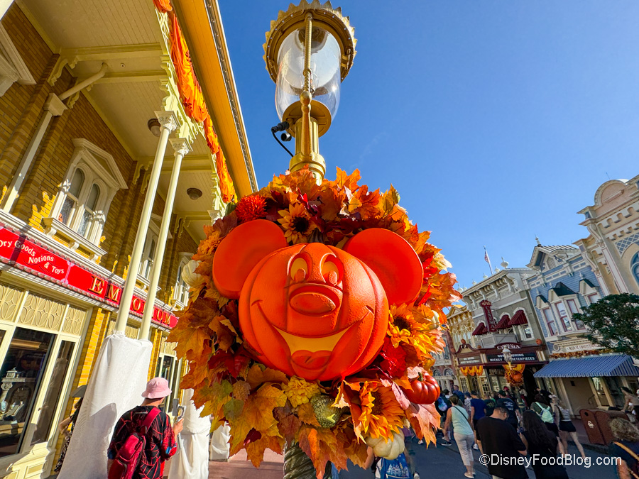 Halloween in Disney World is a very special time. In just a few days, we’ll get to go to the first Mickey’s Not-So-Scary Halloween Party. Halloween also brings new food and drinks to Disney World. However, one of our favorite things about Halloween in Disney World are the decorations in Magic Kingdom, and the Mickey pumpkin wreaths are just so ICONIC. We’re so happy to see that they’re finally up.