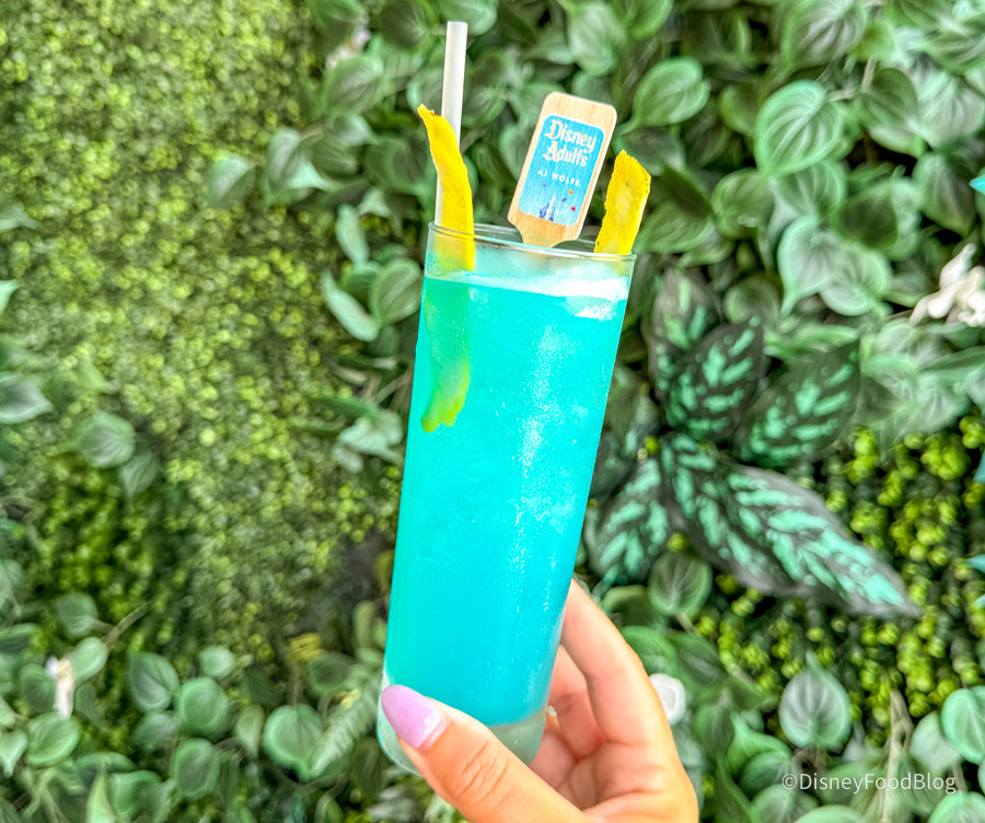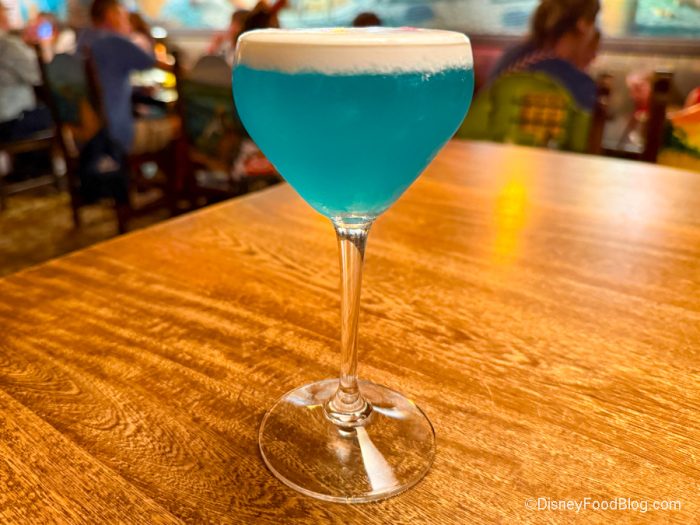 At La Cava del Tequila over in EPCOT, you can also grab the Disney Adults Margarita! It’s made with Pantalones blanco tequila, Calenda mezcal, botanical aperitif, lime juice, a hint of blue curaçao, and cold foam on top (yes, cold foam on a margarita, and it WORKS), and while it’s not super sweet, you get the botanicals from the aperitif and the smoke from the mezcal on top.