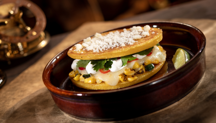 - Cook’s Corn Griddle Cakes with Roasted Corn and Poblano Peppers, $12.00 — Warm Corn Cakes stuffed with Melted Cheese, Lime Sour Cream, Chili Peppers, and Cotija