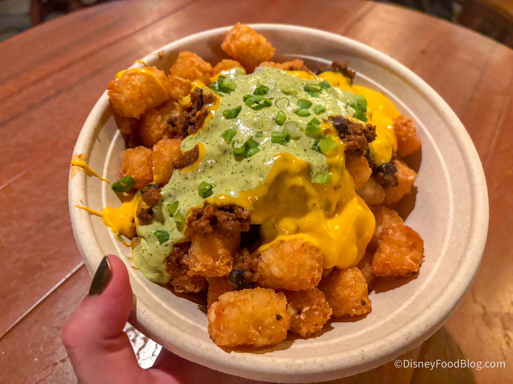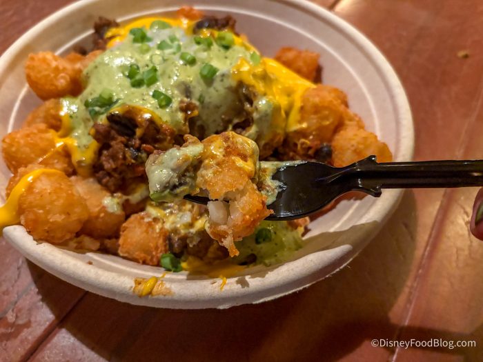 These would be great on a cool, fall day in the parks, but NOT for summer! The chili on top is pretty traditional with some meat and beans and a classic chili flavor, but no spice. However, there is also a jalapeño ranch sauce that’s creamy, herby, and has just a bit of a kick. The liquid cheddar cheese sauce on top was delicious, and the tots were nice and crispy — we were impressed with how well they held up with the chili and sauces. Overall, these were tasty and a great portion of food, but we suggest waiting until it’s cooler to grab them.