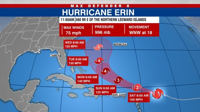 Erin is projected to form into a Category 4 Hurricane. As of right now, Erin is located several hundred miles east of the northern Leeward Islands. We can expect heavy rainfall, so places such as the U.S. Virgin Islands, the Leeward Islands, and Puerto Rico should be aware of possible flash flooding.
