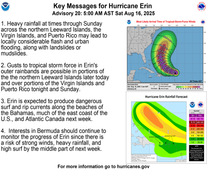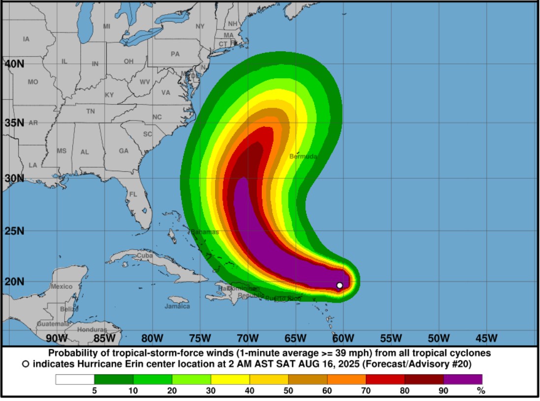 According to the National Hurricane Center, Hurricane Erin is now a Category 5 storm, which is capable of causing massive damage, as well as significant risk to life and property. The hurricane is expected to continue to strengthen today, “followed by fluctuations in intensity through the weekend.”