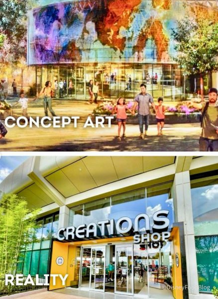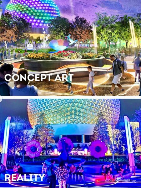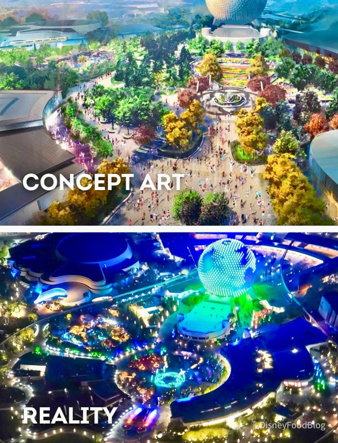 We recently shared an update on our DFB Instagram page about the drastic difference between the concept art and reality of the EPCOT Transformation, and Disney Adults went WILD in the comments with their thoughts on the matter. Taking a look at the comparisons below, the final result doesn’t exactly look like the renderings Disney first showed us.