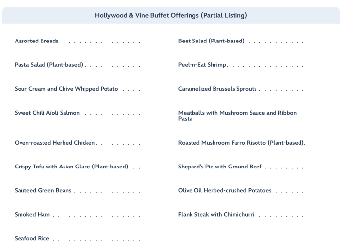 As we mentioned briefly before, the main meal here is served as a buffet. Adults dining here for lunch or dinner can expect to pay $63, and children ages 3-9 are priced at $42. Disney World lists a partial menu on its website for everything that’s offered, and we want to point out that some things can change without notice based on availability. Here’s a look at the main menu offerings!