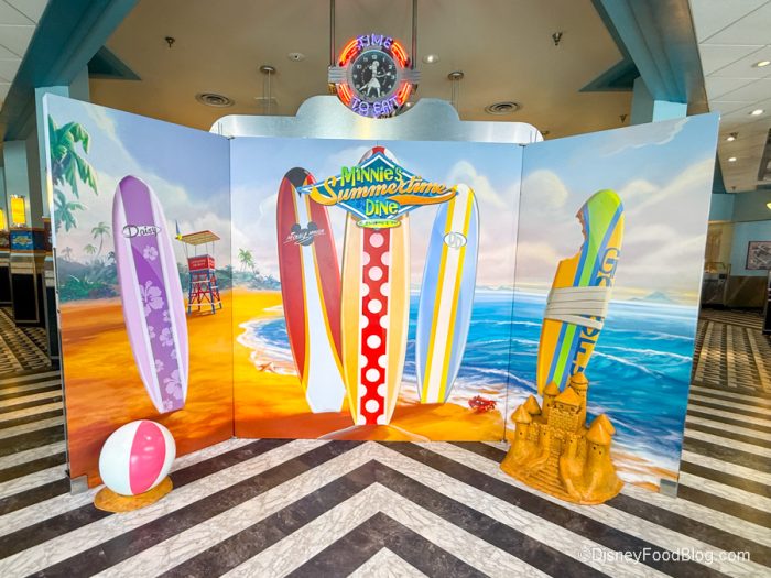 Minnie’s Seasonal Dine has taken over Hollywood & Vine as it changes throughout the year. Not only will the inside theming be notably different, but each of the characters, like Minnie, Goofy, Pluto, and Mickey, will be sporting different outfits depending on the time of the year you’re visiting. The theme when we visited was Summertime Dine. As soon as you walk into the restaurant, there’s a fun summer background or a photo op.