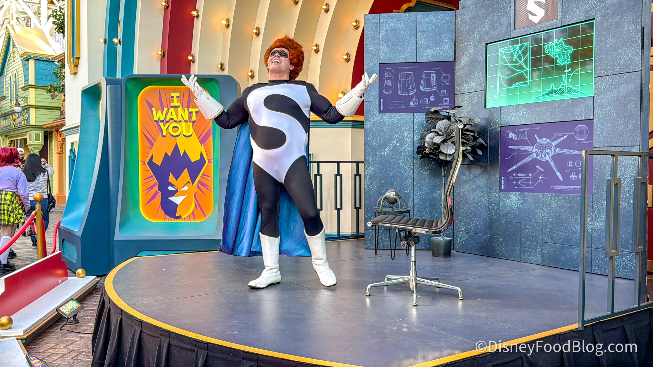 You can find Syndrome on the Syndrome Treat Trail which is near Bing Bong’s Sweet Stuff in Pixar Pier. And we definitely weren’t the only people who were excited about seeing him! After we got the chance to see him, we noticed that his line was all the way over by Goofy’s Sky School. He is quite the popular guy at Oogie Boogie Bash!