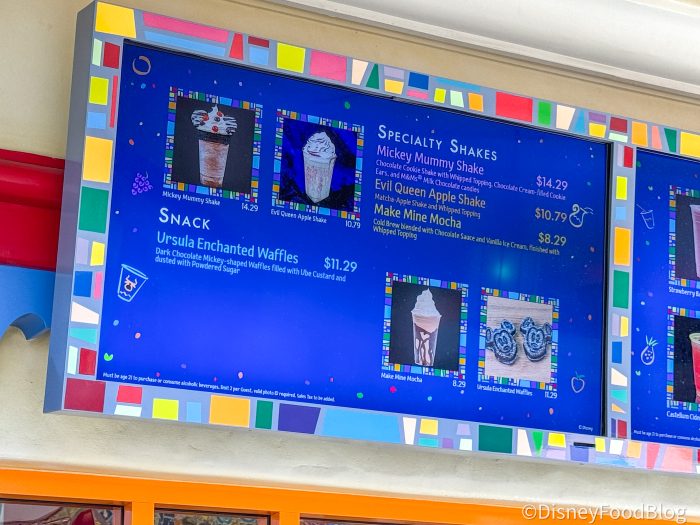 This is where we picked up the Ursula Enchanted Waffles for $11.29. We couldn’t resist the charms of dark chocolate Mickey-shaped waffles filled with ube custard and dusted with powdered sugar, so naturally, we picked up an order and set out to snack for research!