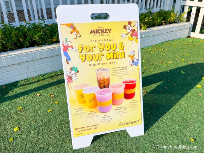 The kids’ menu is inspired by Mickey, Minnie, Goofy, Donald, and Pluto. It features five mini drinks plus a special drink for Mom and Dad! Here’s the menu: