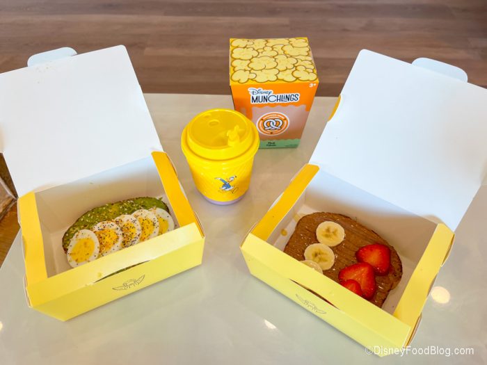You can also get some toasts in mini sizes for kids. One option is strawberries, bananas, and honey (YUM), while the other is avocado…with the option to add eggs.