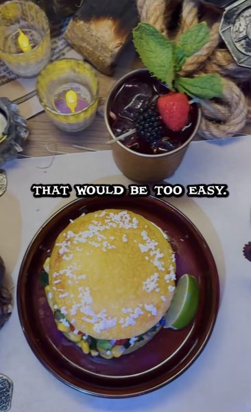 We also got an overhead look at the Cook’s Corn Griddle Cakes with Roasted Corn and Poblano Peppers that you can get for $12. It is warm corn cakes stuffed with melted cheese, lime sour cream, chili peppers, and cotija. There is also the Port of Call for $19. It is made with London Dry Gin, Ruby Port, lemon juice, and spiced cranberry.