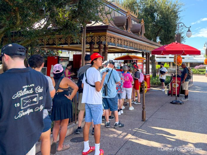 The Stitch Mummy Popcorn Bucket has arrived at popcorn carts in Magic Kingdom. However, when we got in line for it at one popcorn cart, it sold out before we had a chance to get our hands on it. Yep, this baby is going to be SUPER popular. But it IS Stitch…and we all love Stitch, right? Especially when he’s all dressed up for Halloween! So we went to another popcorn cart…and that one also had a pretty long line.
