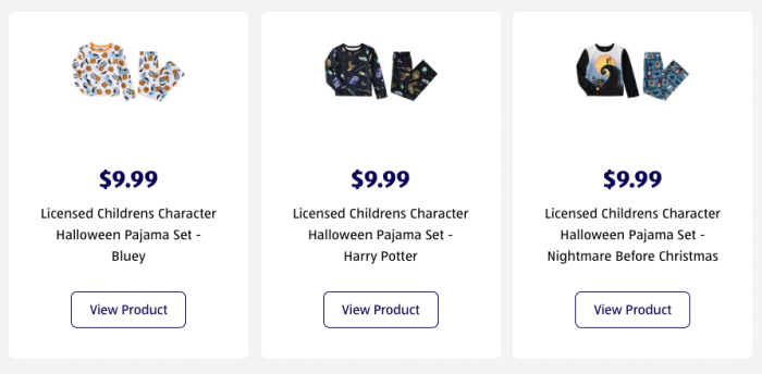 We’re starting off with one of our personal favorites, the Disney Halloween pajamas for kids! ALDI’s got three pairs of them, one inspired by The Nightmare Before Christmas, another inspired by Harry Potter, and the last inspired by Bluey.