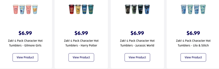 ALDI also has four packs of different character tumblers, including Gilmore Girls, Harry Potter, Jurassic World, and Lilo & Stitch.