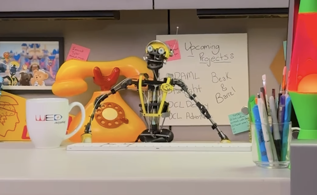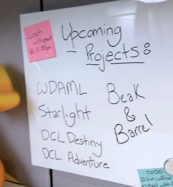 The whiteboard behind Mr. Morrow has a list of upcoming projects that we’ve been following for a while, including Walt Disney: A Magical Life, Disney Starlight, Disney Cruise Line Destiny and Adventure, and Beak & Barrel. There are tons of projects in the works right now, and Disney just dropped major updates on Buzz Lightyear Space Ranger Spin, Beak & Barrel, Zootopia: Better Zoogether coming to the Tree of Life, and Rock ‘n’ Roller Coaster starring The Muppets.