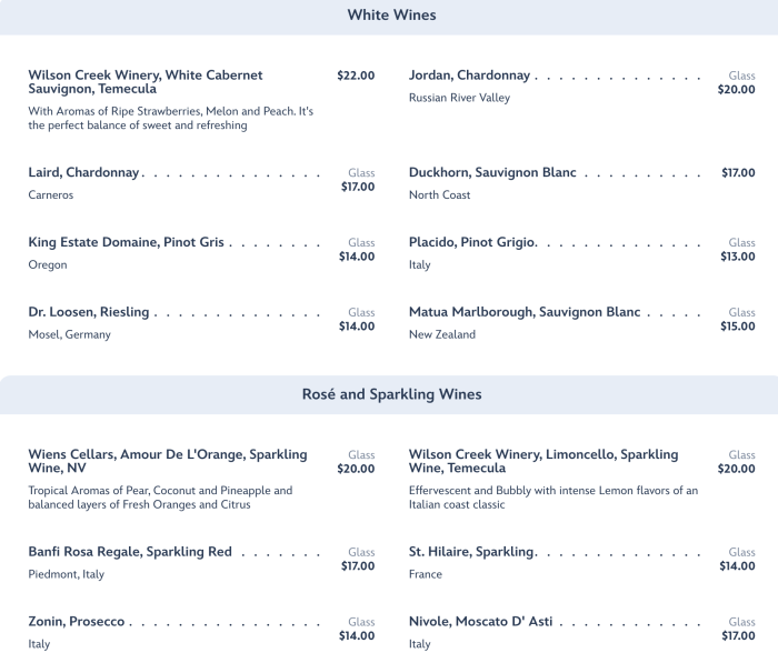 There are multiple different White Wine and Rosé and Sparkling Wines from all over the world to try, plus a special emphasis on different areas of California.