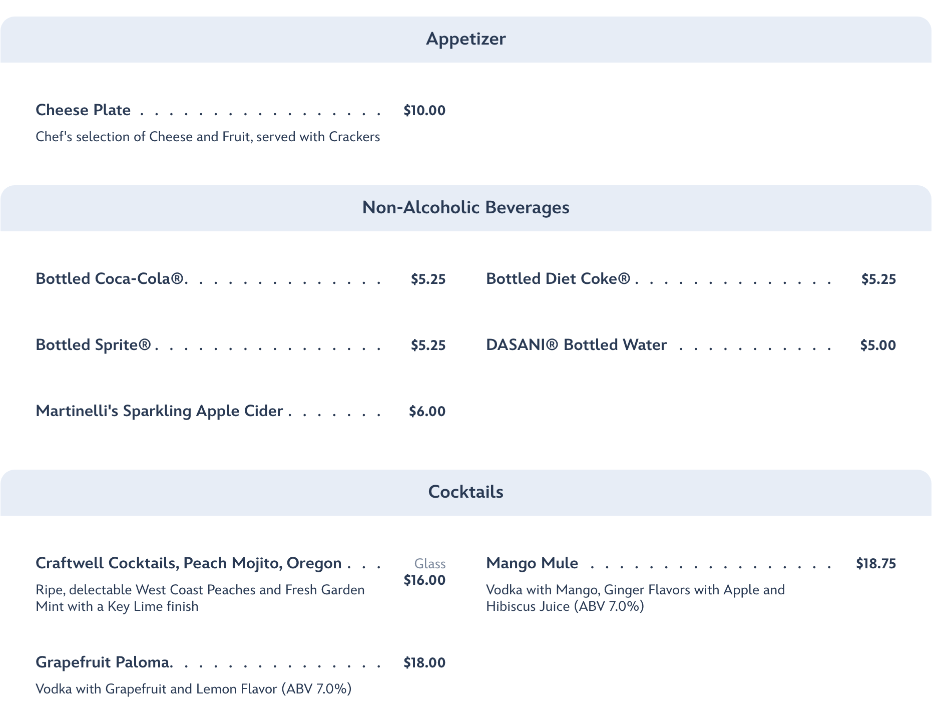 Mendocino Terrace specializes in three things: wine, cheese, and beer. And that’s exactly what’s on the menu! For food options, you’ve got a Cheese Plate, and non-alcoholic beverages are made up of sodas, water, and Sparkling Apple Cider.