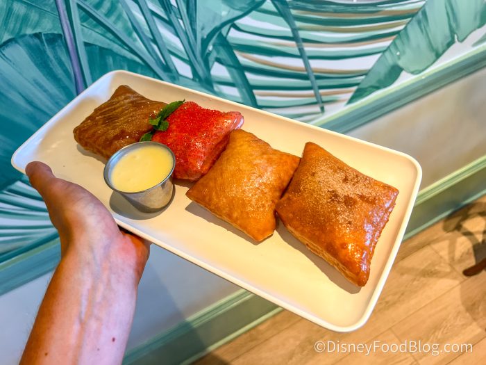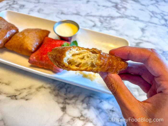 If you’ve been following Disney Food Blog for a while, you know what we LOVE our beignets, and these were no exceptions. Our favorite was the banana foster, which has a light banana taste with hints of caramel and vanilla throughout. The churro and glazed ones were good, but they weren’t incredible standouts for us. For those who love the classic flavors, they’ll want to stick with those. The strawberry one was a bit too sweet and artificial for us, but we enjoyed trying every flavor.