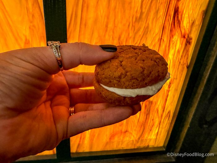 These are phenomenal! They’re served warm, have a nice crunch on the outside, and are soft on the inside. We loved cream cheese spread as well — it has some pumpkin seasoning on top, and we personally love using the spread to make a cookie sandwich.
