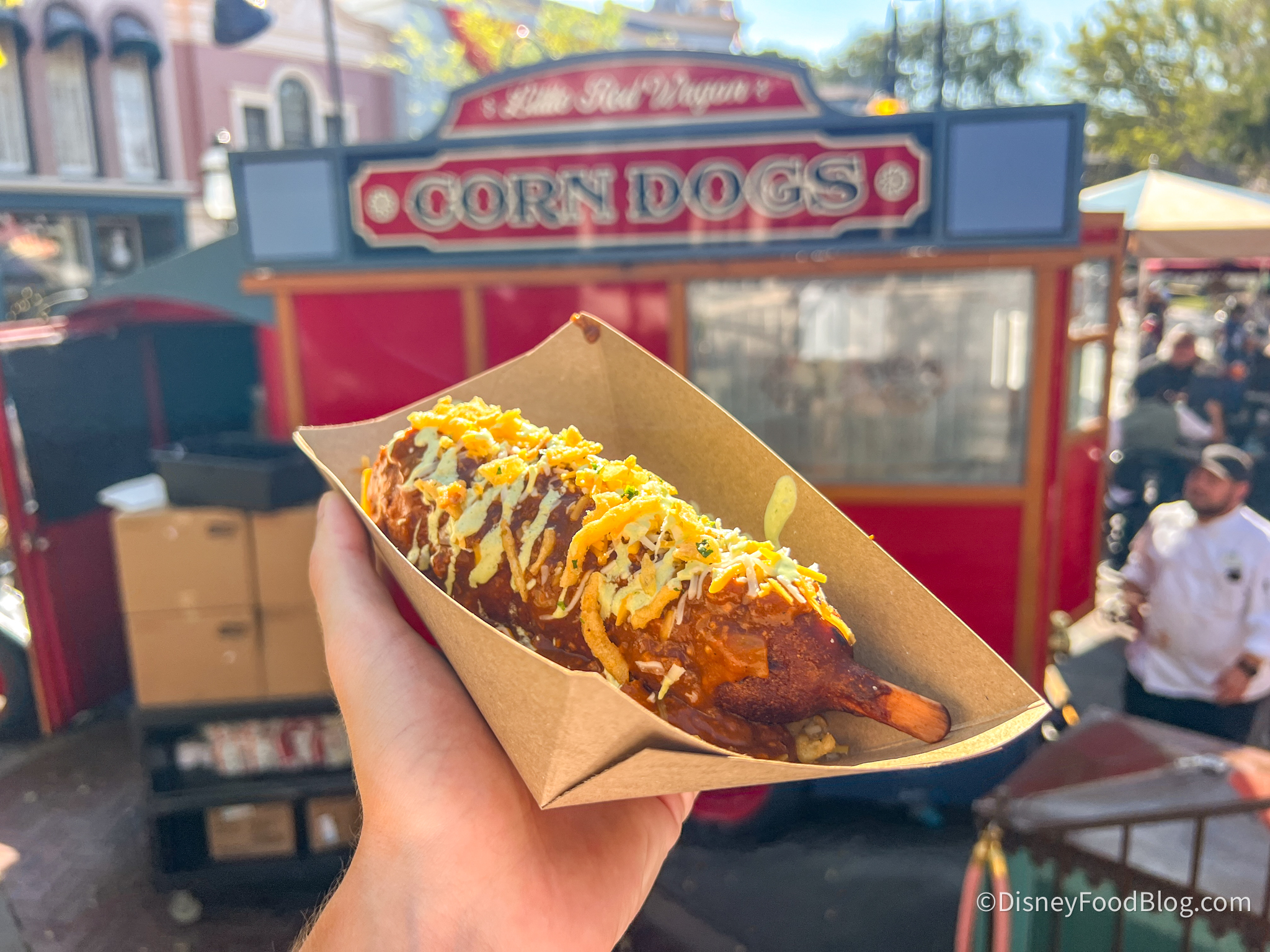 Then we grabbed the Chili Cheese Corn Dog for $14.79, which is a classic corn dog topped with spicy chili, jalapeño-cilantro crema, cheddar cheese, and crispy onions served with a choice of Cuties Mandarin Oranges or potato chips.