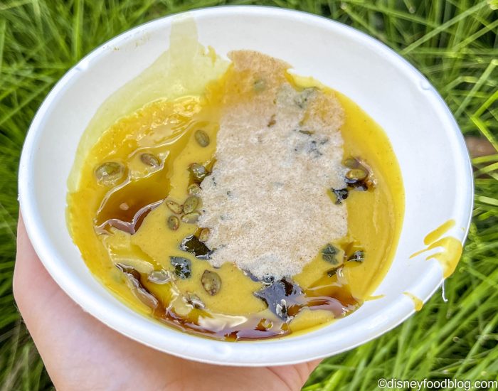 Wow…add this to our Best of the Fest list! This is up there with the best things we’ve had at the festival. If there’s one downside to this dish, it’s the fact that the weather is not ideal for eating this right now. It’s just so hot for this dish. However, we would love to learn how to make this at home for cozy fall dinners. It’s mostly savory, but it’s got a hint of sweetness to it, which we loved. We genuinely loved all these flavors! Like seriously, we love this dish! It feels a little indulgent, and the texture is creamy with nice crunchy pumpkin seeds.