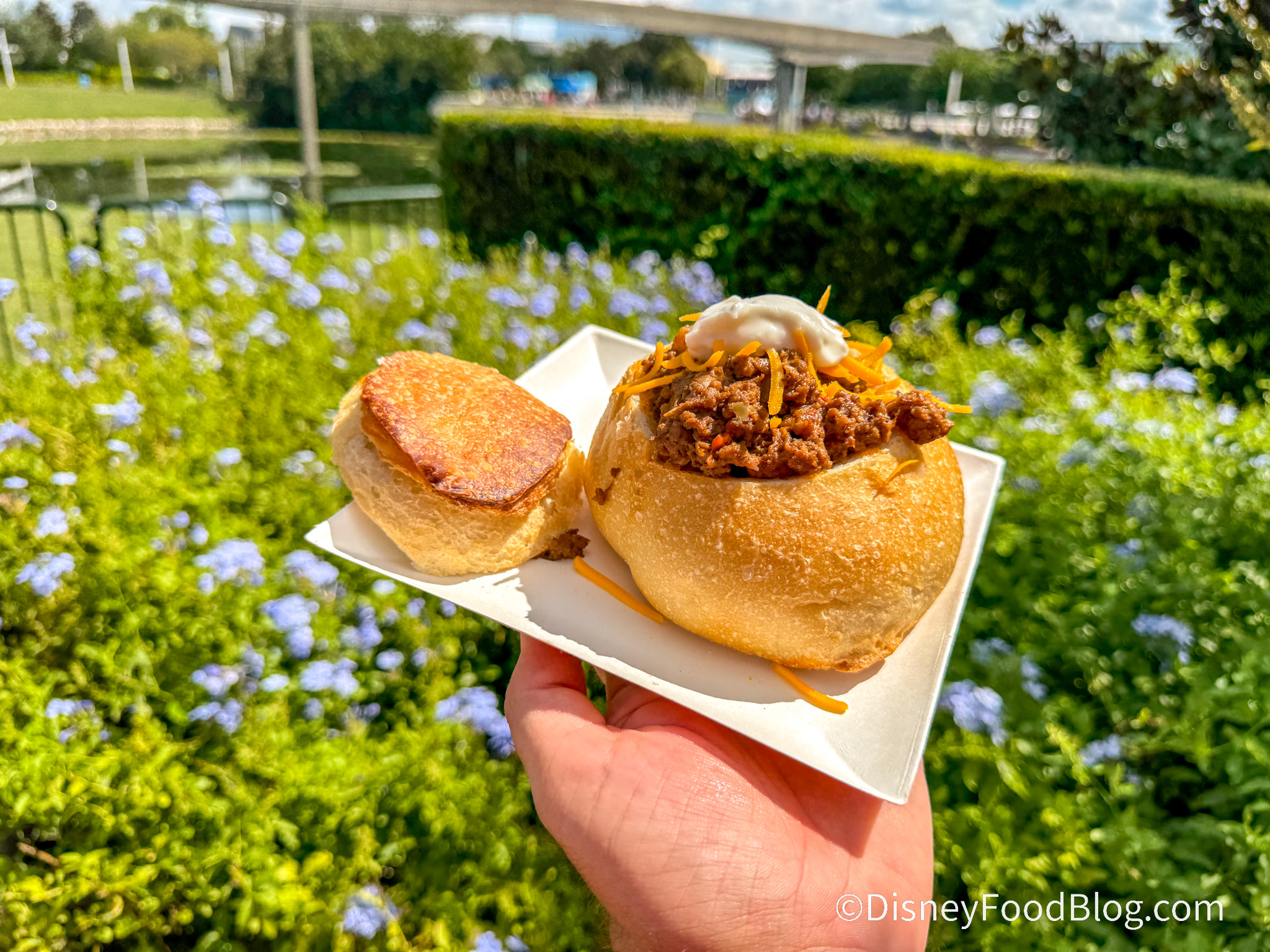 We found it to be very similar to Skyline Chili, if you’ve ever had that brand before. There were notes of cinnamon, nutmeg, and other warming spices, which you usually don’t get in a plant-based dish. The chili itself was on the dry side — it didn’t really soak into the bread bowl at all, which was a smidge disappointing (that’s all the fun of a bread bowl!). But overall, we still really loved it as a plant-based dish because it was elevated, sophisticated in flavors, and came with a whole lotta bread!