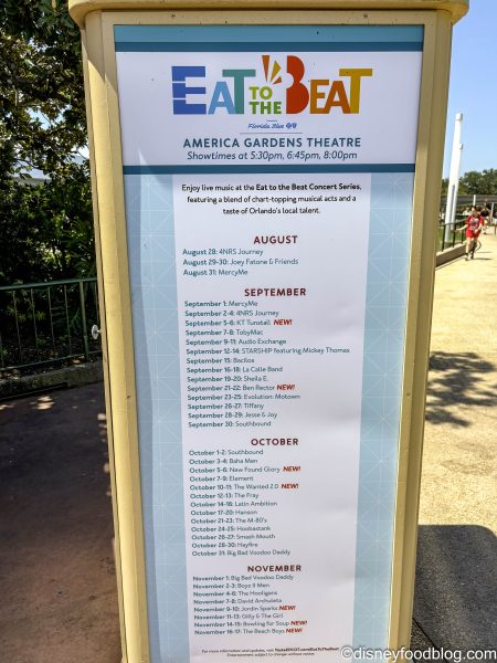 Let’s start with one of the most POPULAR live entertainment offerings at the Food and Wine Festival: the Eat to the Beat Concert Series. Throughout the Festival, popular bands (including some BIG names) take the stage at the American Gardens Theatre in The American Adventure Pavilion for the Eat to the Beat Concert Series.