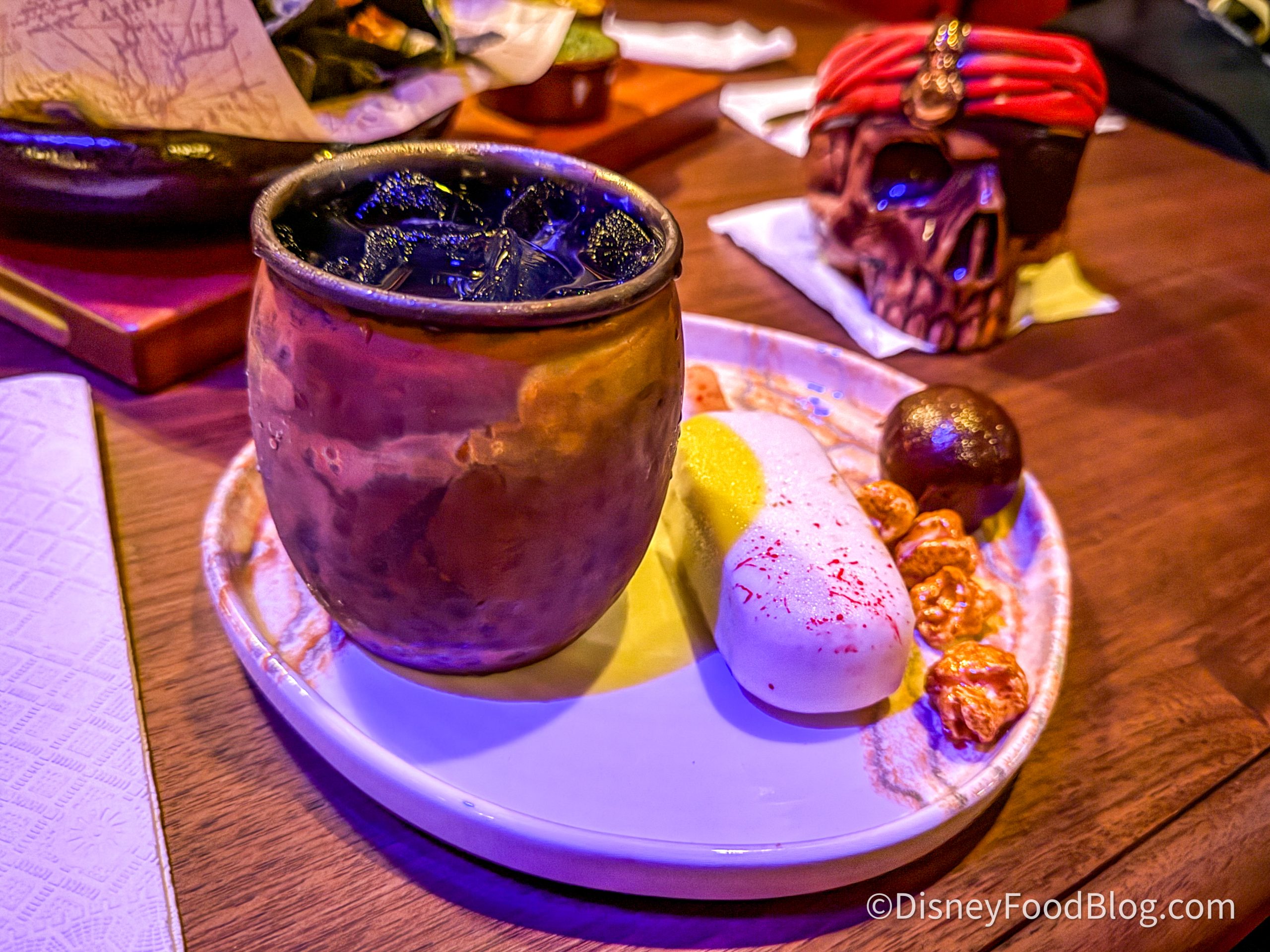 We also got to try the Cursed Treasure, which costs $7.75. Phew — now that price brings us back down to earth. As you may have guessed by the under $10 price tag, this is a non-alcoholic drink option. In terms of the flavor, it is an indulgent blend of coconut milk and cookie crumbs topped with vanilla foam and pirate’s gold.