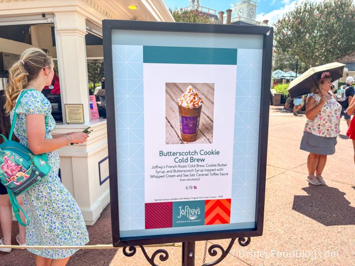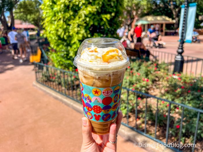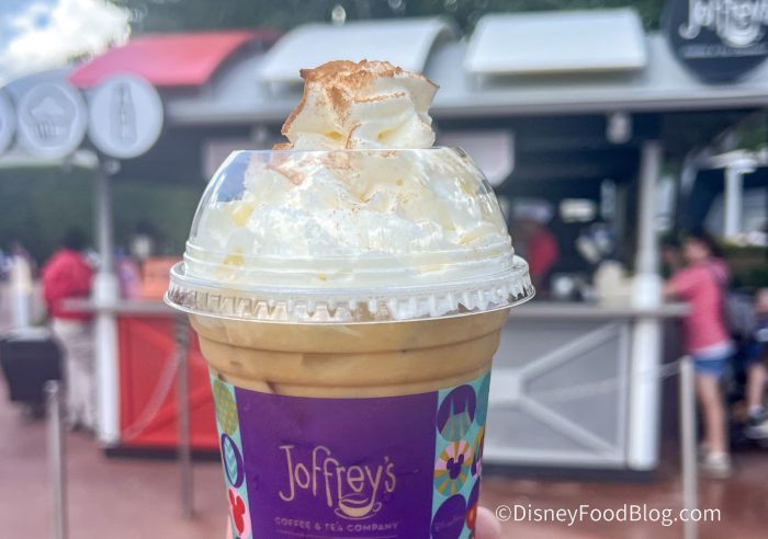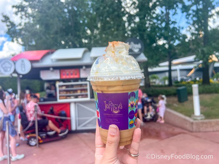 Four Joffrey’s locations, four different Festival-specific drinks! Let’s go! At the American Adventure Joffrey’s, you’ll find the Butterscotch Cookie Cold Brew made with Joffrey’s French Roast Cold Brew, cookie butter syrup, and butterscotch syrup topped with whipped cream and sea salt caramel toffee sauce.