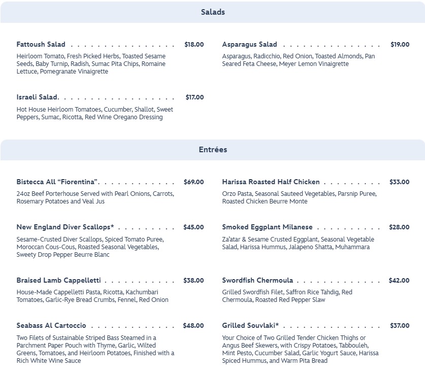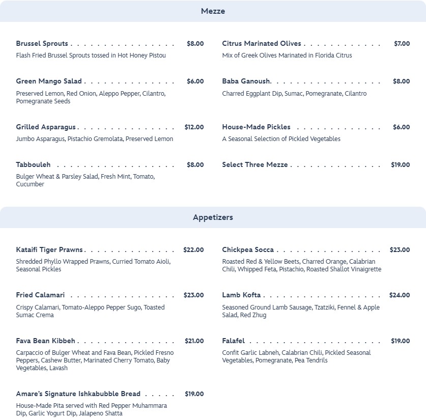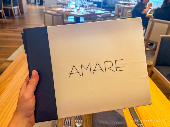 You can enjoy breakfast at Amare from 7 AM until 11 AM. Lunch is served from 11:30 AM until 2 PM, and dinner is available from 5 PM until 11 PM. Reservations are recommended for dinner. We recently stopped by to enjoy some dinner, so let’s take a look at the menu!
