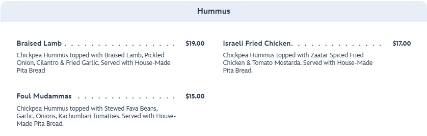 First up, we grabbed Amare’s Signature Ishkabubble Bread for $19. It comes with house-made pita served with red pepper muhammara dip, garlic yogurt dip, and jalapeno shatta. The chef actually came out and talked to us about this dish, which we loved! The name “Ishkabubble” is actually made up, and they created this dish in-house. While it is reminiscent of Eastern Mediterranean cuisine, it is not something you will necessarily find there. They crafted the dough so it could get blown up to the size of a basketball, and it comes served with three dips.