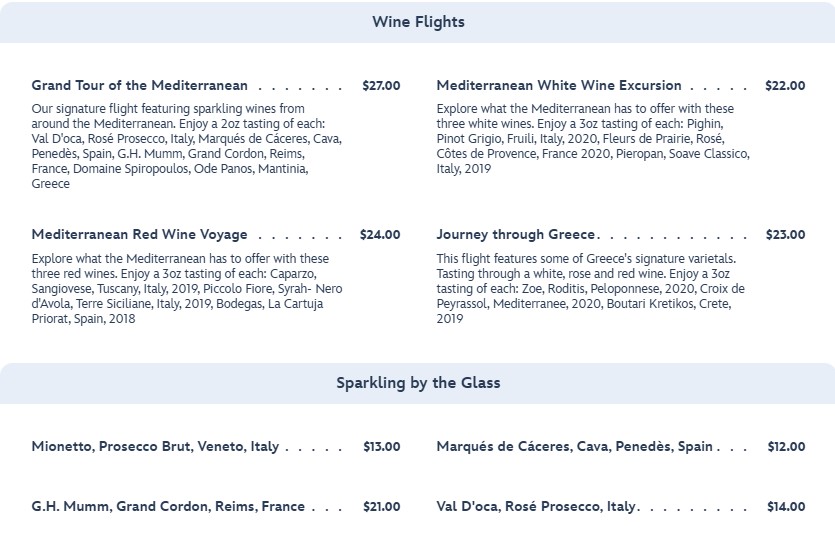 To drink, we picked up the Journey through Greece Wine Flight for $23. This flight features some of Greece’s signature varietals. It features a 3oz tasting of each: Zoe, Roditis, Peloponnese, 2020, Croix de Peyrassol, Mediterranee, 2020, Boutari Kretikos, Crete, 2019.