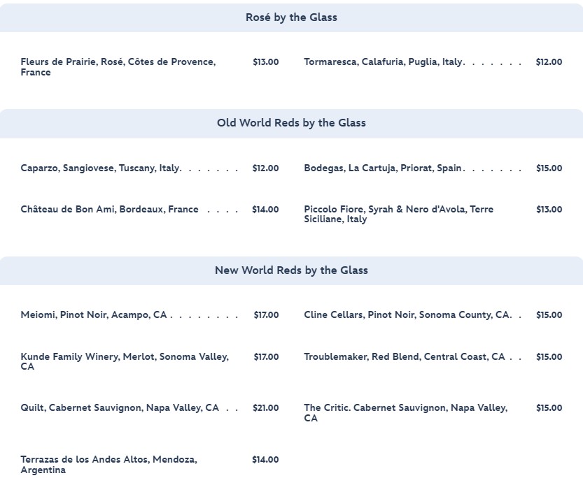 Or, you can get a rose, Old World red, or New World red by the glass.