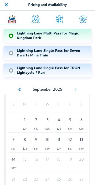 When you purchase Lightning Lane Multi Pass (LLMP), you’re essentially buying the ability to reserve return times for certain attractions. It’s Disney’s version of skipping long standby lines, and it’s sold per park per day. The pricing varies slightly depending on the park, but here’s what the prices are for September 1st, 2025: