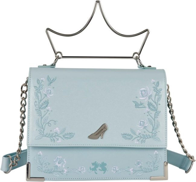 This purse is fit for a Disney Princess and is designed and themed to Cinderella. It has a beautiful embroidered design of flowers and birds with a glass slipper on the front. At the bottom of the bag, you can see the silhouettes of Jaq and Gus. The handle is a tiara!