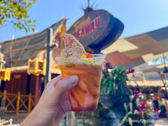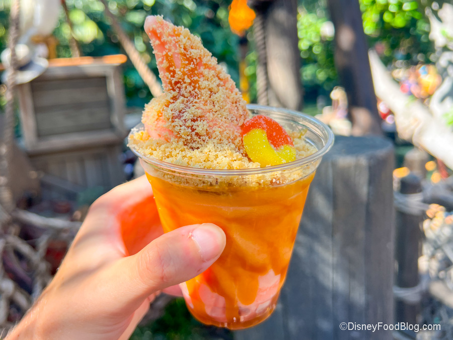 If you’ve visited Disneyland, you’ll probably already know that Tropical Hideaway is one of the best spots to grab a DOLE Whip in Disneyland. Well, sometimes, this dining spot brings a new snack in, which is the case with the new Peach Sundae, made with DOLE Whip Peach with Caramel Drizzle, topped with Streusel and a Peach Ring for $9.29. Peach. Dole Whip. We can’t even.