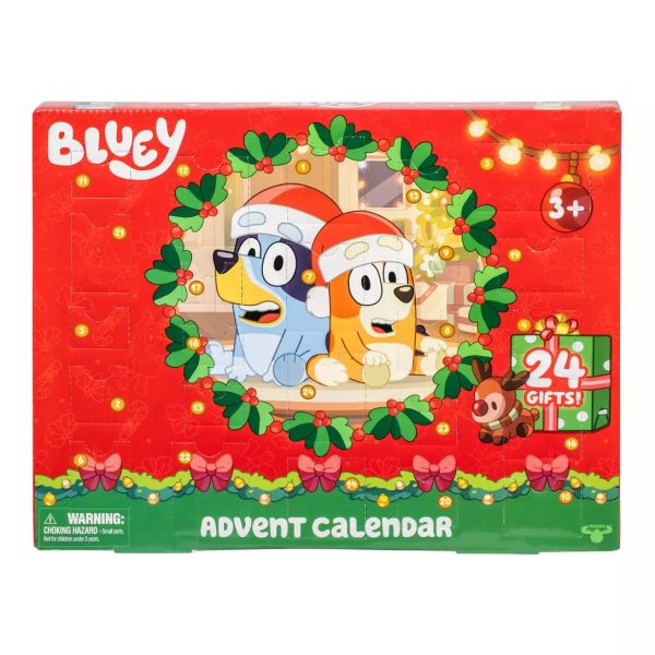 The calendar has 24 small gifts behind each numbered door. There are small figures inside, including Bluey, Bingo, Mum, and Dad, and other holiday surprises.