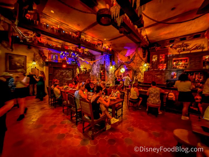 The Beak and Barrel is Magic Kingdom’s very first dedicated bar and lounge, inspired by Pirates of the Caribbean. Inside, you’ll find multiple different seating areas, each with a distinct theme, but like most restaurants, you don’t get to choose where to sit. Instead, you’ll be shown where to sit by your pirate host, and that’s where you’ll stay for your whole experience.