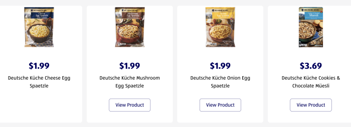 In pouches, you can grab types of Spaetzle like Cheese Egg, Mushroom Egg, and Onion Egg. These sound like great meals to keep on hand when you need them in a pinch.