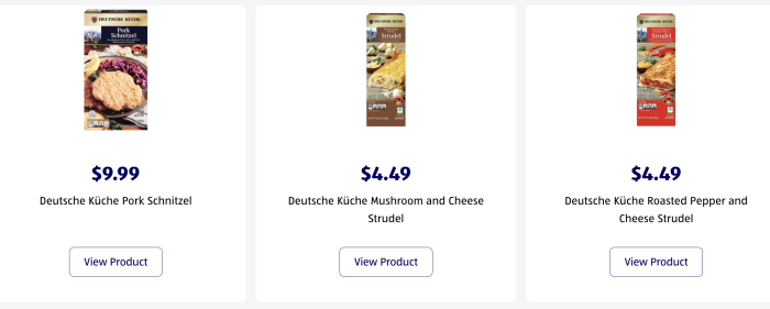 Try the Mushroom and Cheese Strudel or the Roasted Pepper and Cheese Strudel. They have Pork Schnitzel, and it all sounds so good. I’m getting hungry just thinking about it.