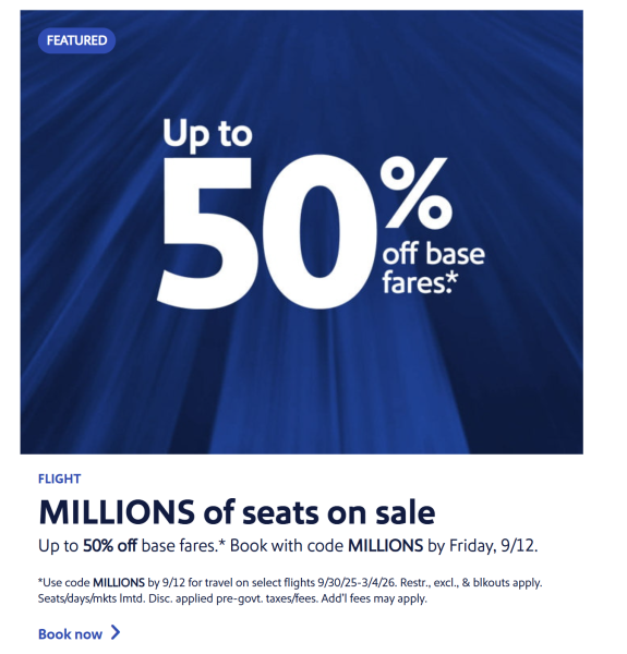 Southwest is offering 50% off fares with the code MILLIONS. You have to purchase your flight before September 12th for air travel between September 30th, 2025, and March 4th, 2026.