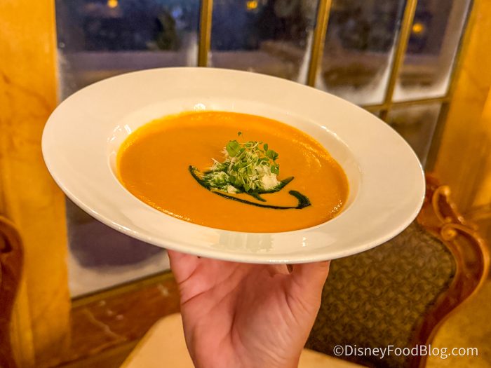 And finally, we’ve got a hidden gem to share in the form of the new Blue Crab Bisque Soup! This dish replaced the Potato and Leek Soup on the menu, and it’s finished with brandy, crème fraîche, and chive oil. You even get a lump of blue crab in the middle!