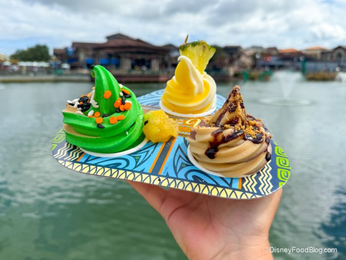 If these unique flavors don’t sound that appetizing to you, you’re in luck! There are tons of interesting flavors, such as the DOLE Whip Mango and Chamoy Float at Aloha Isle, the I Lava You Float (Fanta Strawberry Soda and Passion Fruit flavor served with DOLE Whip Orange and topped with popping candy) at Sunshine Tree Terrace, and the Ursula Cone (Wild Berry Soft-serve with candy coral and citrus cotton candy in a black vanilla cone) at Storybook Treats. All three restaurants are found at Magic Kingdom.