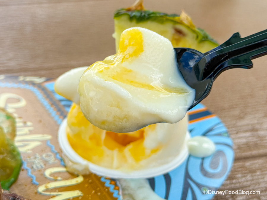 The first is a classic DOLE Whip Pineapple, swirled with vanilla soft-serve and a fresh pineapple wedge. It’s hard to beat the classic tangy pineapple with a creamy vanilla soft-serve. While the wedge is more of a unique addition, this flavor is reliably good and never lets us down.