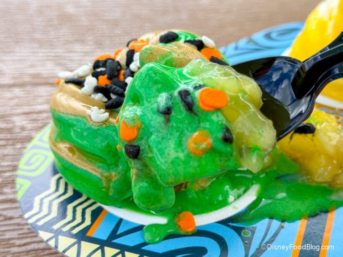 The Green Apple Soft-serve is swirled with salted caramel soft-serve, apple pie filling, and Halloween sprinkles, and the flavor reminded us of The Sanderson Sisters Caramel-Apple Pie Sundae at Swirls on the Water. The green apple is VERY green and sweet, and the salted caramel adds some fun texture and sweetness of its own. We have to warn you, though — this treat has a super-strong salted caramel flavor, so if you generally disagree with that kind of flavor, this won’t be the treat for you.