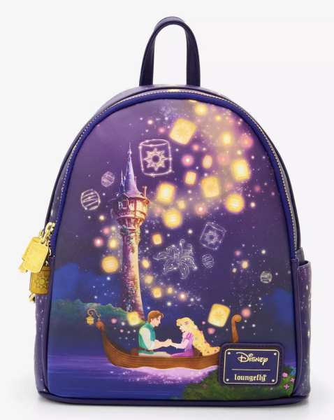 If you’re looking for a classic backpack that features one of the most iconic scenes from the film, the Loungefly Disney Tangled Lantern Scene Light-Up Mini Backpack is perfect! It doesn’t have a front pocket, so that’s something to be aware of, but there ARE two side pockets.